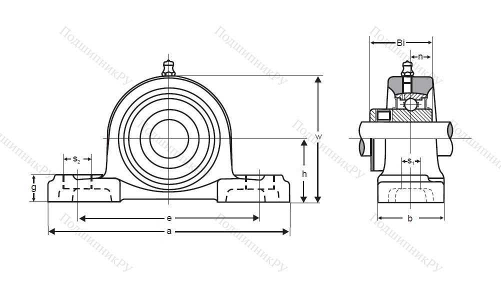 В конструкцию детали входит корпусный подшипник типа UC, установленный в корпус типа Р из чугуна с нишей сферической формы. Монтаж на вал осуществляется посредству кольца, оснащенного парой штифтов, закручиваемых шестигранником, что обеспечивает самовыравнивание.
